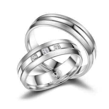 Moderne Trauringe / Partnerringe und Verlobungsringe aus mehrfach rhodiniertem 925er Sterlingsilber. Die Oberfläche beider ca. 5,5mm breiten Ringe ist teilweise mattiert, teils poliert. Der Damenring ist mit 3 strahlenden Zirkonia-Steine veredelt. Diese Silberringe sind hochwertig verarbeitet und sitzen durch ihre Bombierung (an der Ringinnenseite abgerundet) sehr bequem am Finger.