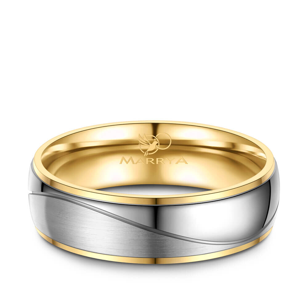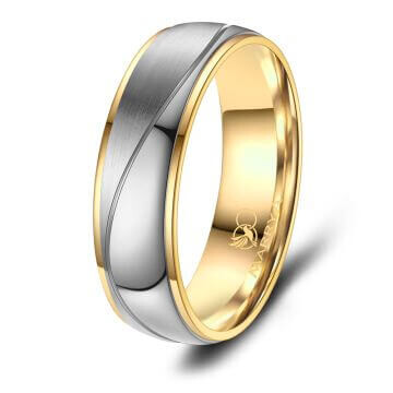 Ein faszinierender Ring aus Titan mit Gelbgoldplattierung. Titan ist für seine vergleichsweise hohe Kratzfestigkeit und Stabilität bekannt, trotzdem ist es relativ leicht. Zusätzlich ist dieser Ring vonn innen abgerundet (bombiert). Dies sorgt für ein besonders angenehmes Tragegefühl am Finger.