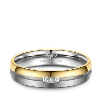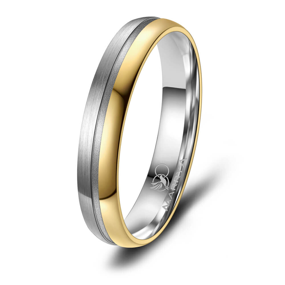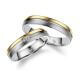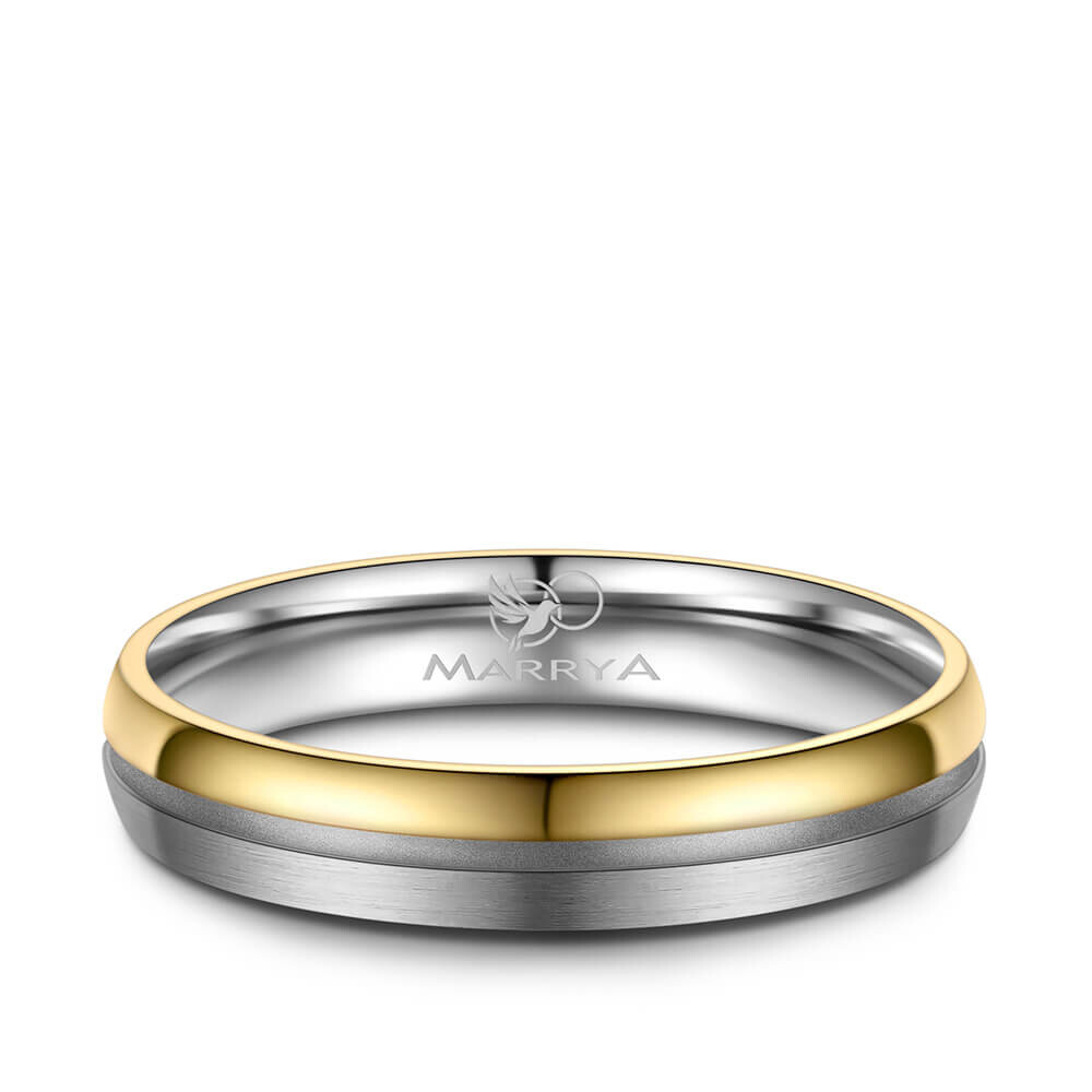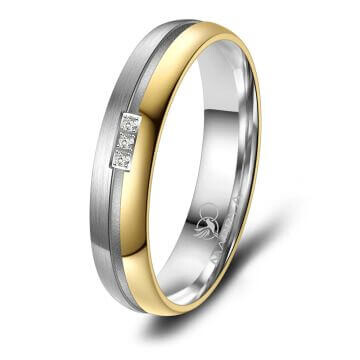 Bicolor Trauringe / Partnerringe und Verlobungsringe aus mattiertem Titan mit polierter Gelbgold-Plattierung. Der Damenring ist mit mehreren weißen Zirkonia verziert. Diese ca. 4mm breiten Titanringe mit umlaufender Fuge sind hochwertig verarbeitet und sitzen durch ihre Bombierung (an der Ring-Innenseite abgerundet) sehr bequem am Finger.