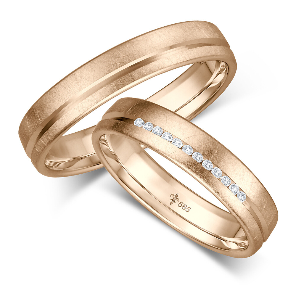 Wunderschöne roségoldene Trauringe Pia aus der Manufaktur Giloy mit mattierter Oberfläche. Der Damenring ist mit mehreren Diamanten veredelt. Beide Ringe sind bombiert, für angenehmen Tragekomfort.
