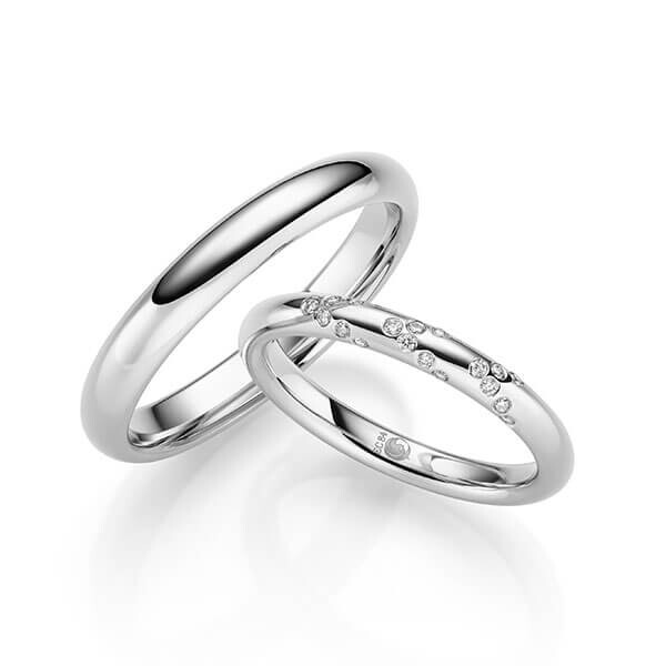 Paar Trauringe / Eheringe von Rubin Außen stark, innen leicht gerundet in Platin 600/-. Steinbesatz mit zus. 0,105 ct. tw, si - feines weiß mit kleinen Einschlüssen.