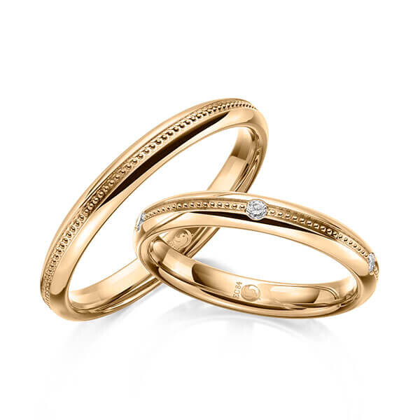 Paar Trauringe / Eheringe von Rubin Außen stark, innen leicht gerundet in Roségold 375/-. Steinbesatz mit zus. 0,1 ct. tw, si - feines weiß mit kleinen Einschlüssen.