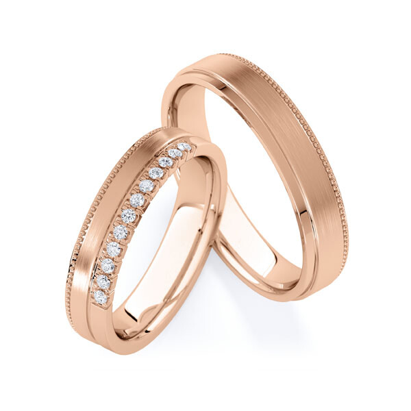 Paar Trauringe / Eheringe von Rubin Außen flach, innen leicht gerundet, gerade Kanten in Rotgold 333/-. Steinbesatz mit zus. 0,12 ct. tw, si - feines weiß mit kleinen Einschlüssen.
