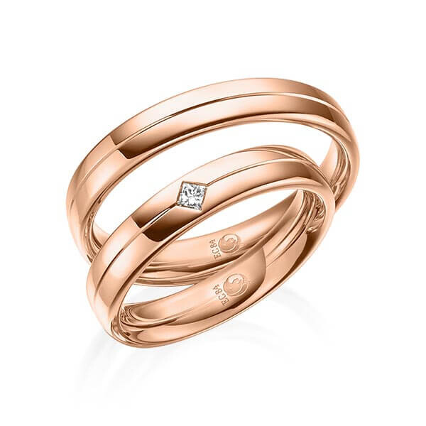 Paar Trauringe / Eheringe von Rubin Außen leicht, innen stark gerundet in außen Rotgold 333/- , innen Rotgold 333/-. Steinbesatz mit zus. 0,07 ct. tw, si - feines weiß mit kleinen Einschlüssen.