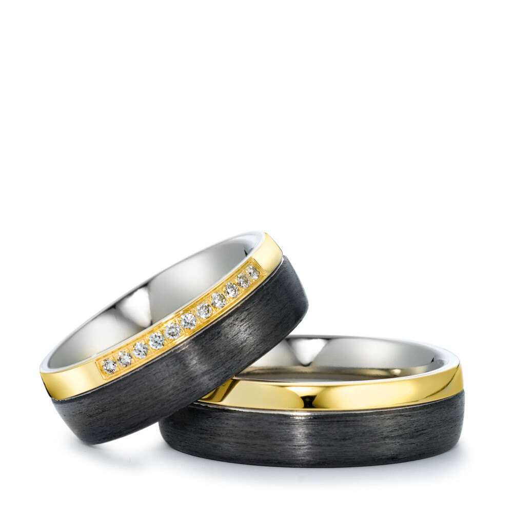 Spezielle Trauringe aus Titan, Carbon & Gelbgold - so stark, wie eure Liebe! Für alle die das Besondere lieben sind diese fantastischen Ringe das Richtige: 11 Brillanten im Kanal gefasst mit ges. 0,11 Carat in Schmuckqualität w/si verzieren den Damenring und lassen ihn strahlen. Beide Ringe fallen außerdem durch ihre super schöne Oberflächen ins Auge. Ringe die man erleben muss.