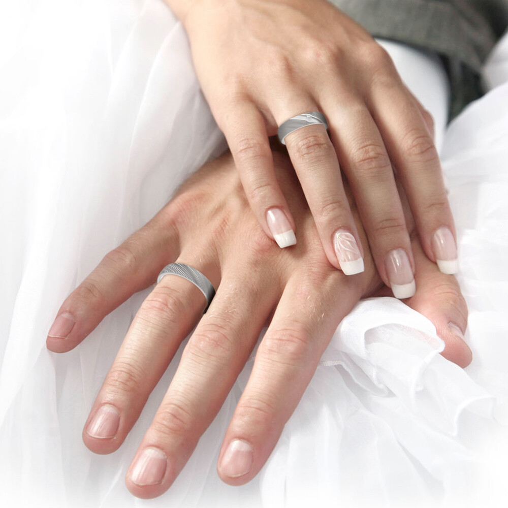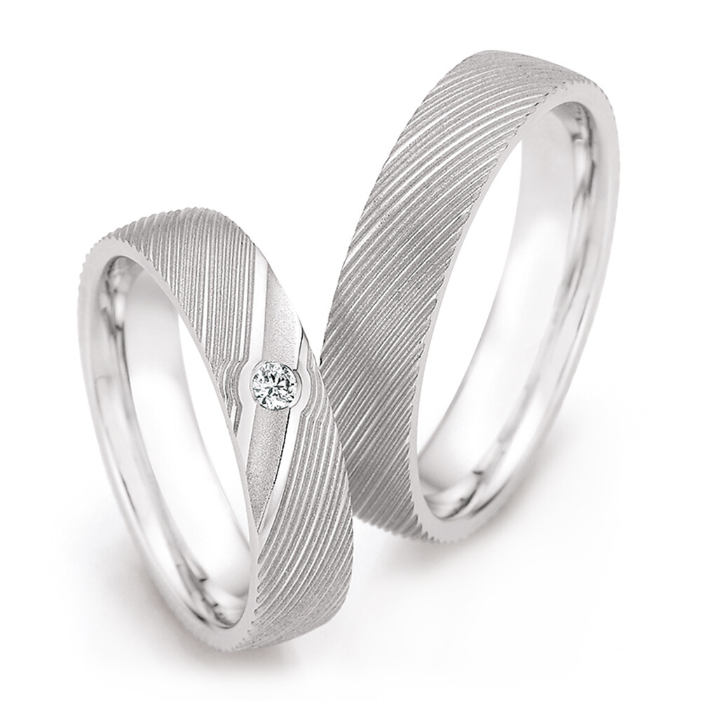 Wunderschöne, elegante Trauringe aus Weißgold der Marke Collection Ruesch aus der Kollektion Honeymoon Solid XV mit strukturierter Oberfläche. Diese edlen Eheringe mit einem funkelnden Brillanten am Damenring sind für einen angenehmen Tragekomfort bombiert (abgerundet).