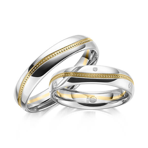 Paar Trauringe / Eheringe von Rubin Außen und innen gerundet in Palladium 950/- Gelbgold 585/-. Steinbesatz mit zus. 0,03 ct. tw, si - feines weiß mit kleinen Einschlüssen.