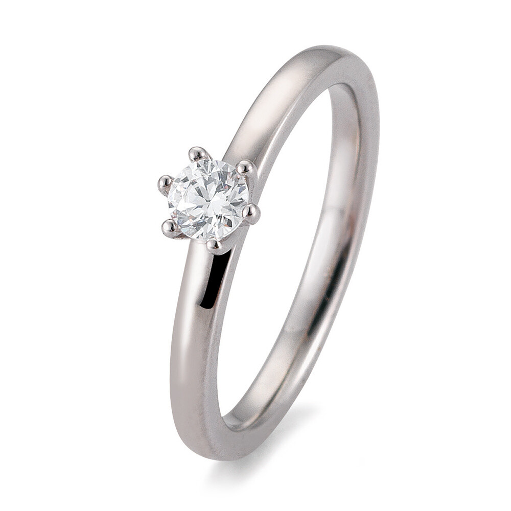 Der Verlobungsring mit 6er Krappe von Breuning überzeugt mit seinem klassischen Design aus Platin. Darüber hinaus ist er mit einem strahlendem Solitär verdelt.
