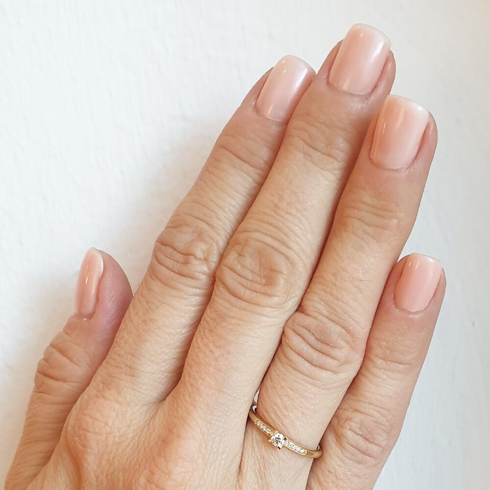Ein atemberaubender Verlobungsring Pavé aus edlem Gelbgold mit einem Mittelstein in sicherer 4er-Krappe und mehreren Brillanten entlang der Ringschiene. Ein fantastischer Ring im Boho-Style als Liebesbeweis für die Angebetete.