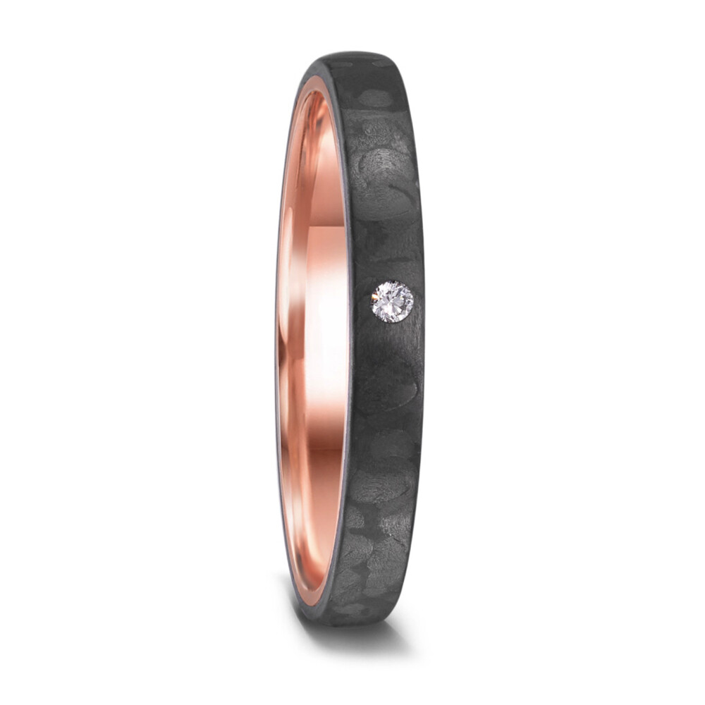 Sehr ausgefallene, schmale Eheringe oder Partnerringe aus 585er Rotgold fest ummantelt mit schwarzem Carbon im schlichten und zeitlosen Design. Der Damenring ist mit einem funkelnden Brillanten veredelt welcher in Kombination mit dem dunklen Carbon besonders strahlt. Das Ringprofil ist innen und außen leicht bombiert, das sorgt für angenehmen Tragekomfort. Wunderschöne Ringe Made in Germany!